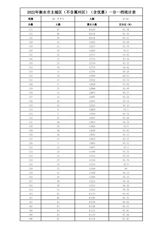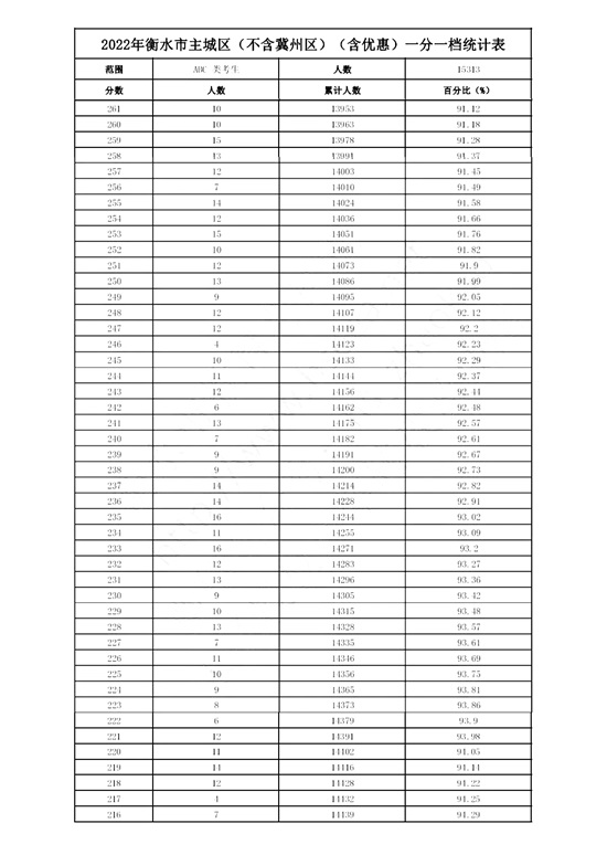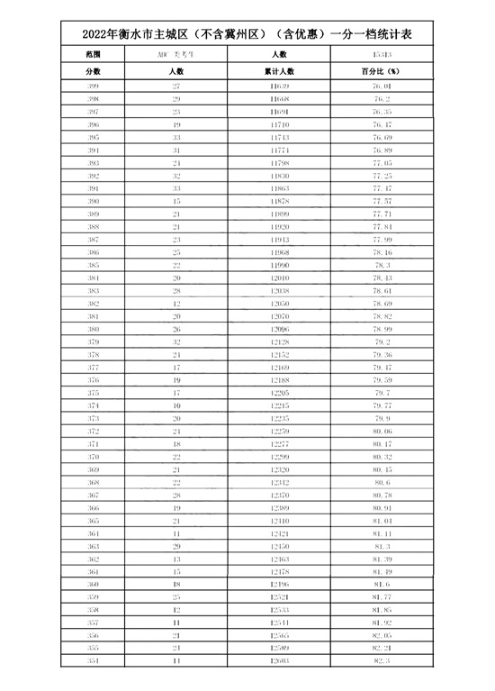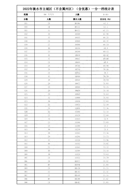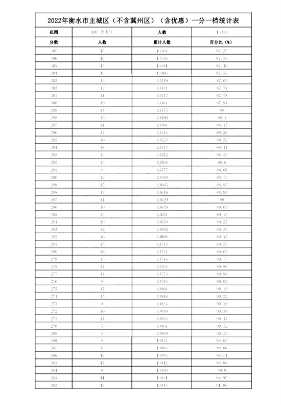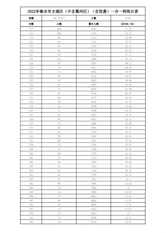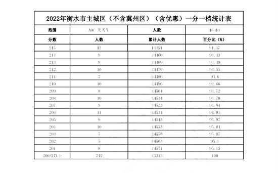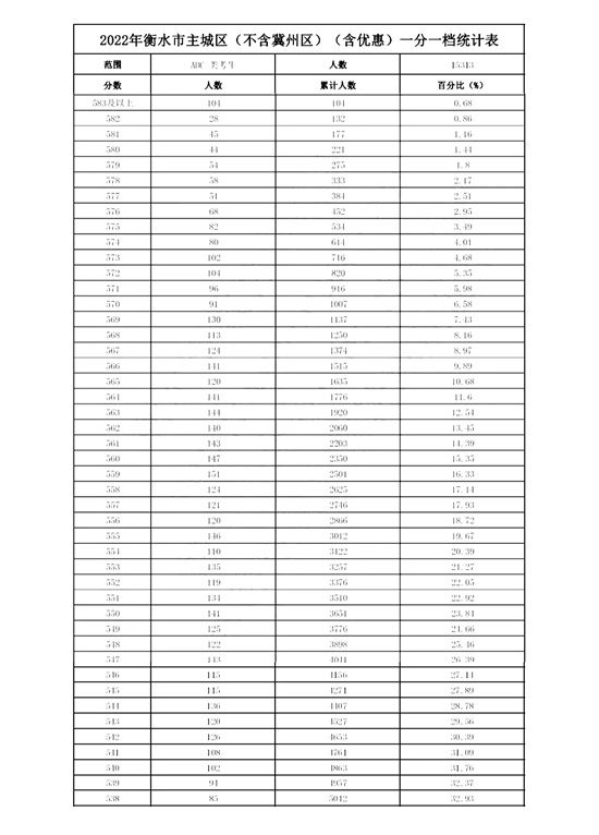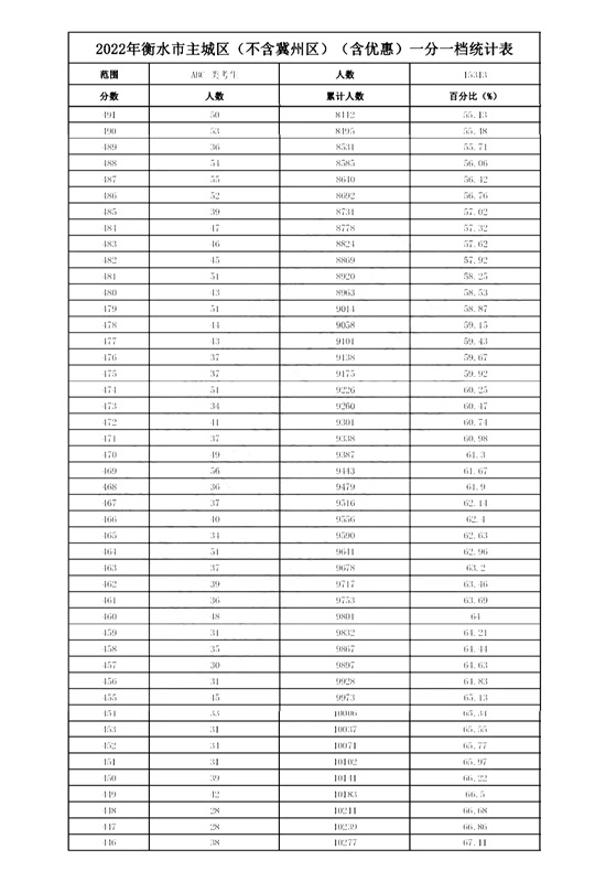 2022年衡水市主城区(含优惠)一分一档统计表(不含冀州区)